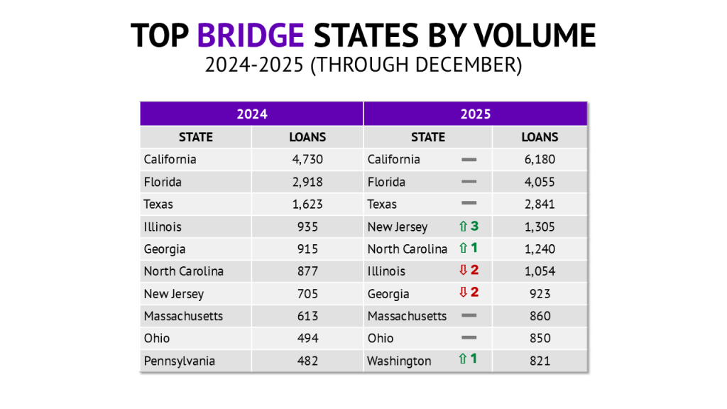 The top three states for bridge loans have remained consistent, with California, Florida, and Texas continuing to lead the way. New Jersey emerged as the largest mover among the large markets in 2025, rising to become the fourth-largest bridge loan market. Illinois and Georgia both slipped a few spots after showing relatively little year-over-year growth. Pennsylvania fell out of the top 10 entirely, while Washington moved in to take its place.