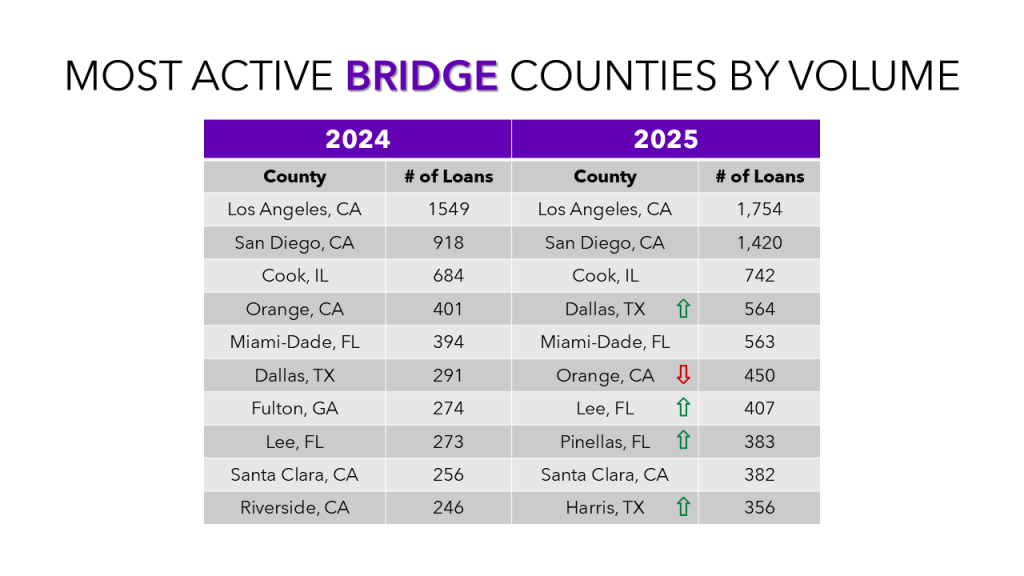 Los Angeles County maintained its position as the top bridge loan county. A huge year from San Diego, significantly closed the gap between the top two markets. The top three states dominated this list with Cook, IL being the only county not in CA, FL, or TX on the list.