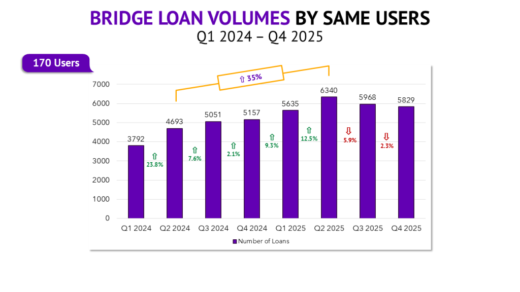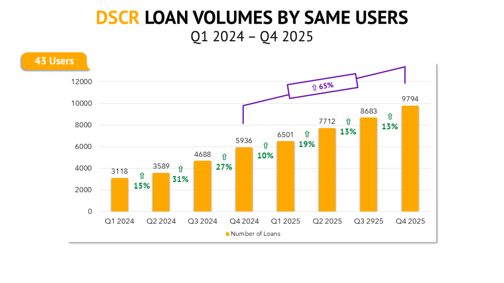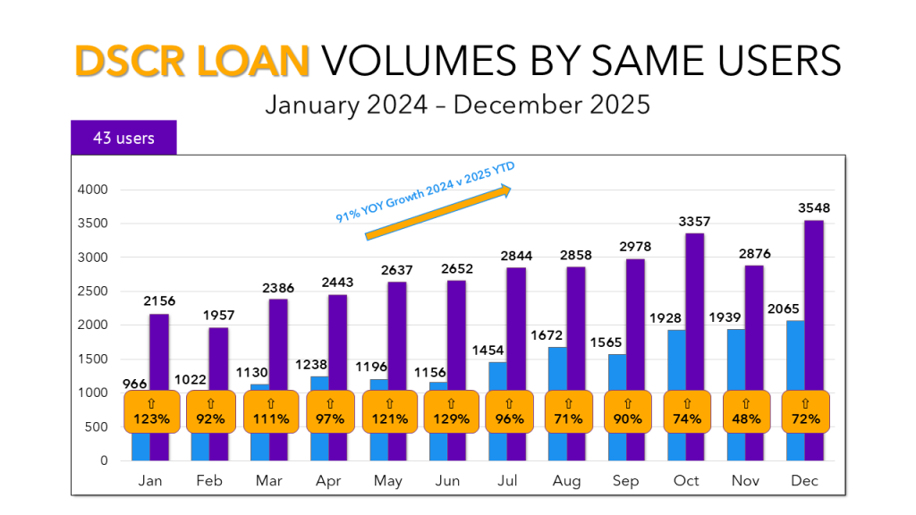Unlike bridge loans, no matter which way you look at it, DSCR lending experienced tremendous growth in 2025. On an annual basis, DSCR lending was up 91% year-over-year among Lightning Docs users that have been on the platform since 2024. On a quarterly basis, loans are up at least 10% each quarter dating back to the start of 2024. And with 3,548 DSCR loans in December, we ended the year with a record-high month, the tenth record month in 2025.