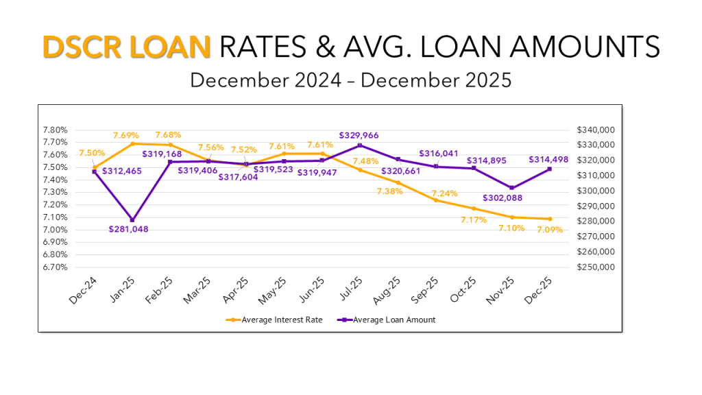 Average DSCR interest rates also continued to trend downward throughout the year, finishing 60 basis points lower than where they began. If this trajectory holds, average rates could dip below 7% in 2026. DSCR loan amounts remained relatively stable, with most months falling in the $315,000 to $320,000 range. The year ended at $314,498, consistent with that pattern.