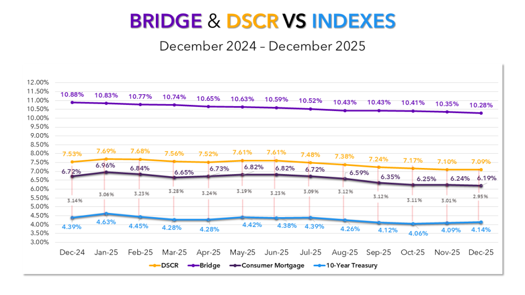 In addition to the private lending interest rates we track, consumer mortgage rates have also been trending downward. At 6.19% in December, they’re 77 basis points lower than where we started the year. The 10-Year Treasury, while 39 basis points lower than where it began 2025, has ticked upward over the past few months. An increase to 4.14% in December timed with another decrease in DSCR rates led to the smallest spread we’ve seen in over a year at 2.95%.
