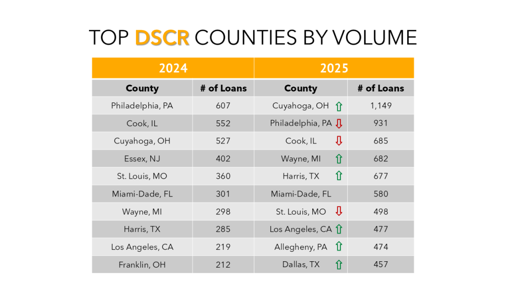 Cuyahoga, OH took over as the top DSCR county in 2025. Last year’s #1 market, Philadelphia, dropped just one spot to #2. Alleghany, PA and Dallas, TX are new to the top 10 taking over for Wayne, MI and Franklin, OH which both dropped out.