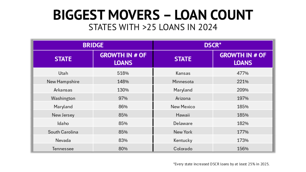 Looking back at 2025, the data reinforces what many lenders experienced firsthand: private lending continues to adapt and grow, even in uncertain environments. While bridge lending showed signs of stabilization late in the year, DSCR lending clearly emerged as the primary growth engine, with expanding volumes, narrowing spreads, and increasing participation across every state. Geographic diversification also accelerated, with several non-traditional markets posting outsized year-over-year gains.