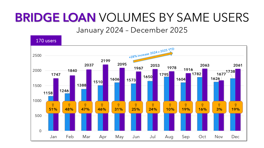 There are a few ways we can look at the status of bridge loans. On an annual level, bridge loan transactions were up 28% over 2024. In a vacuum that’s impressive growth, but when compared to previous years or this year’s DSCR performance, it pales in comparison. Then we could look at it on a quarterly basis. After an all-time high in Q2, we’ve seen two straight quarters of decreasing volume. While that seems like a pessimistic signal, a more granular view reveals a promising development. Following a very disappointing November with 1,677 total bridge loans, I voiced concern that similar performance in December could mean the first month of negative growth we’ve seen. Thankfully that didn’t happen. With 2,061 loans in December, Lightning Docs users produced the fourth highest total of 2025. The strong finish to 2025 could signal a return to the steadier growth pattern bridge lenders had become accustomed to in prior years.