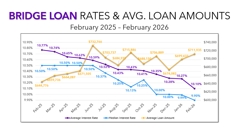 We’ve come to expect decreasing average interest rates for bridge loans each month, but the 17-basis-point drop in February is by far the largest decrease we’ve seen in the past year. It appears we’re soon headed for a sub-10% average, while the median interest rate is already there at 9.90%.