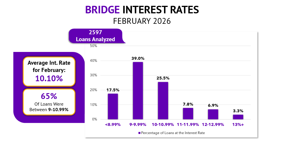 The distribution of bridge loan interest rates continues to skew lower as the average drops. 56% of all bridge loans are now priced below 10%, and 39% fall in the 9–9.99% range. Another 2.5% of loans nationally have shifted below 9%, for a total of 17.5% across 2,597 bridge transactions in February.