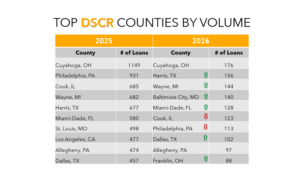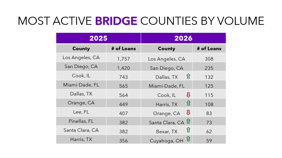 Looking at the counties driving the most volume, it’s no surprise to see Los Angeles and San Diego at the top. Cook County, IL has long held the number three spot behind those two, but that changed last month when Dallas and Miami-Dade both passed it. Another surprise is Cuyahoga County appearing in the top 10 for bridge lending — while it typically leads the nation in DSCR transactions, it finished 2025 as only the 21st largest bridge lending market.