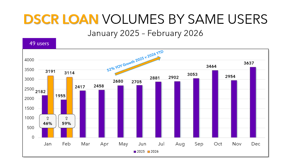 However, February set a record of its own. With 314 loans per business day, we saw the most activity ever on Lightning Docs. For reference, only one other month — December 2025, with 302 loans per business day — has broken the 300 mark. Bridge loans are once again showing year-over-year growth, while DSCR growth continues its strong trajectory.