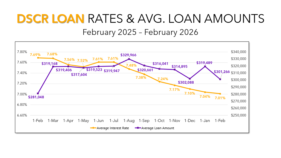 DSCR interest rates and loan amounts are both nearing thresholds we haven’t seen in some time. Average interest rates dropped three basis points to 7.01%, meaning another decline next month would likely push the national average below 7% for the first time in nearly four years. With an average loan amount of $301,266, DSCR loans are also approaching the $300,000 mark — a level not seen since February 2025.