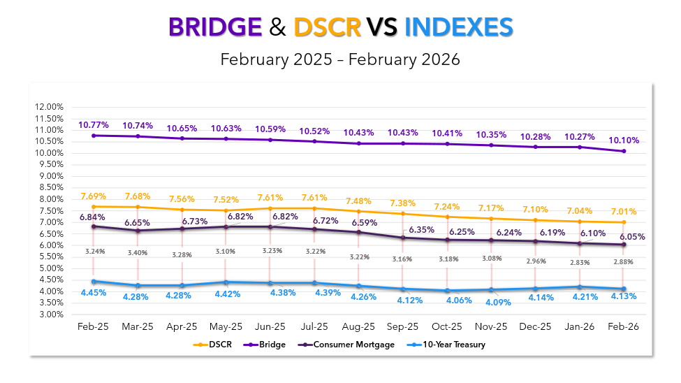 February also brought declines across the broader rate environment. Along with decreases in average bridge and DSCR interest rates, consumer mortgage rates fell by five basis points and are now close to dipping back below 6%. After two months of increases, the 10-year Treasury yield dropped eight basis points in February. Spreads between it and DSCR loans remain tight at 2.88%.