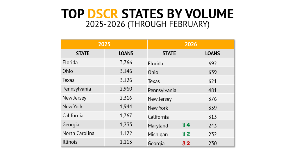 Unlike bridge lending, the top states for DSCR lending have remained largely consistent with 2025. The biggest change so far is Maryland, which jumped four spots to enter the list at #8, while Illinois dropped out of the top 10 to #13.