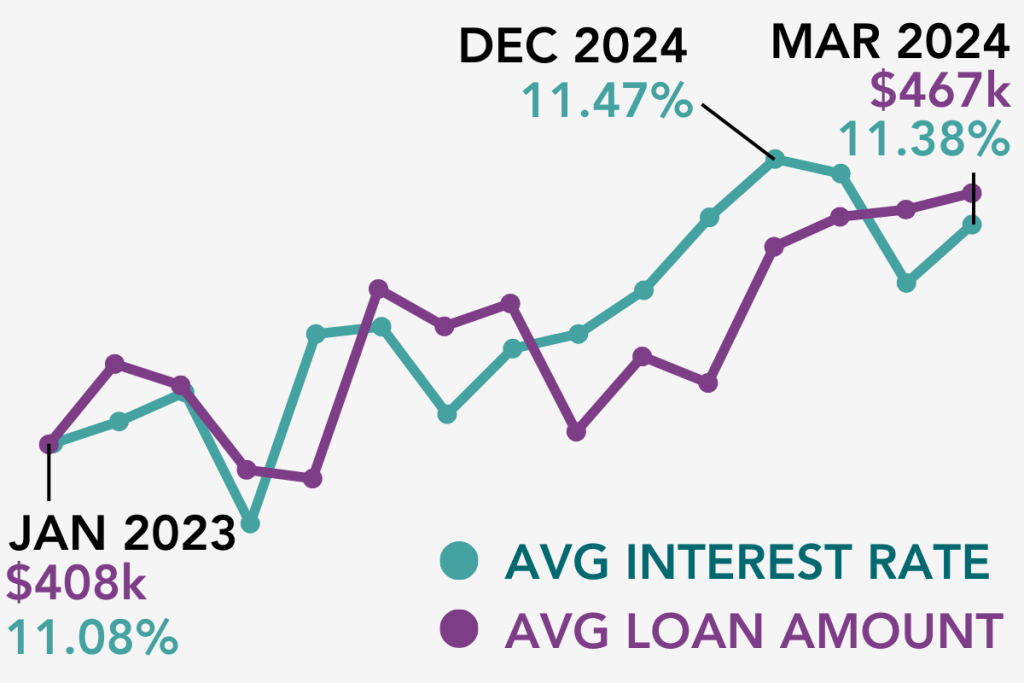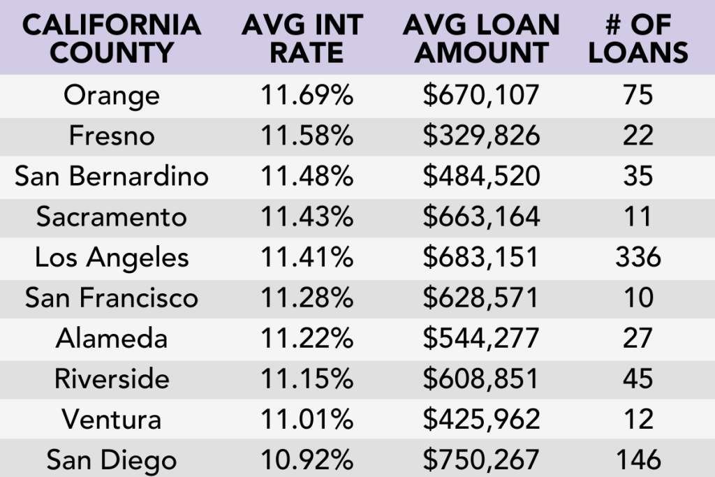 California remains the largest and most concentrated bridge loan market. The state has multiple counties which have a sweet spot of large average loan amounts and at or above national interest rates. Orange County remains notable with an average loan balance of $670k, average interest rate of 11.69% across 75 transactions in Q1 2024.
