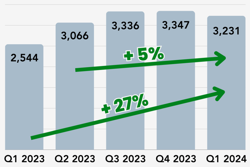 Q1 2024 loan volumes were up significantly (27%) compared YOY to Q1 2023. It’s not time to pop champagne bottles quite yet as quarterly loan volumes have remained mostly stable last year from Q2 on and if you compare Q2 2023 to Q1 2024 it’s only a 5% increase in volumes.