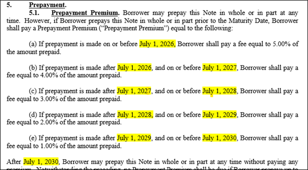 We updated the language for step prepayment premiums (linear and non-linear versions) to make the PPP period conform to the duration of our other PPP provisions. Specifically, we replaced the formula of “x year(s) from the Date of Advance” to reflect a specific date which is also consistent with the other PPP options.  See example below: